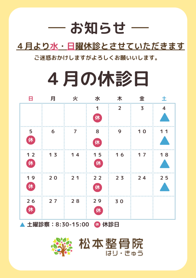令和8年4月より水・日曜日休診とさせていただきます。ご迷惑おかけいたしますがよろしくお願いいたします。