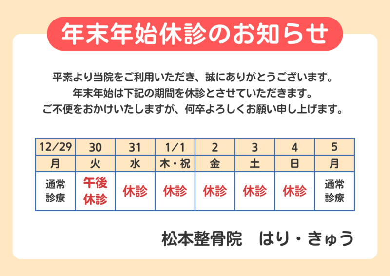 12月30日(火)午後 ~1月4日(日)まで休診とさせていただきます。